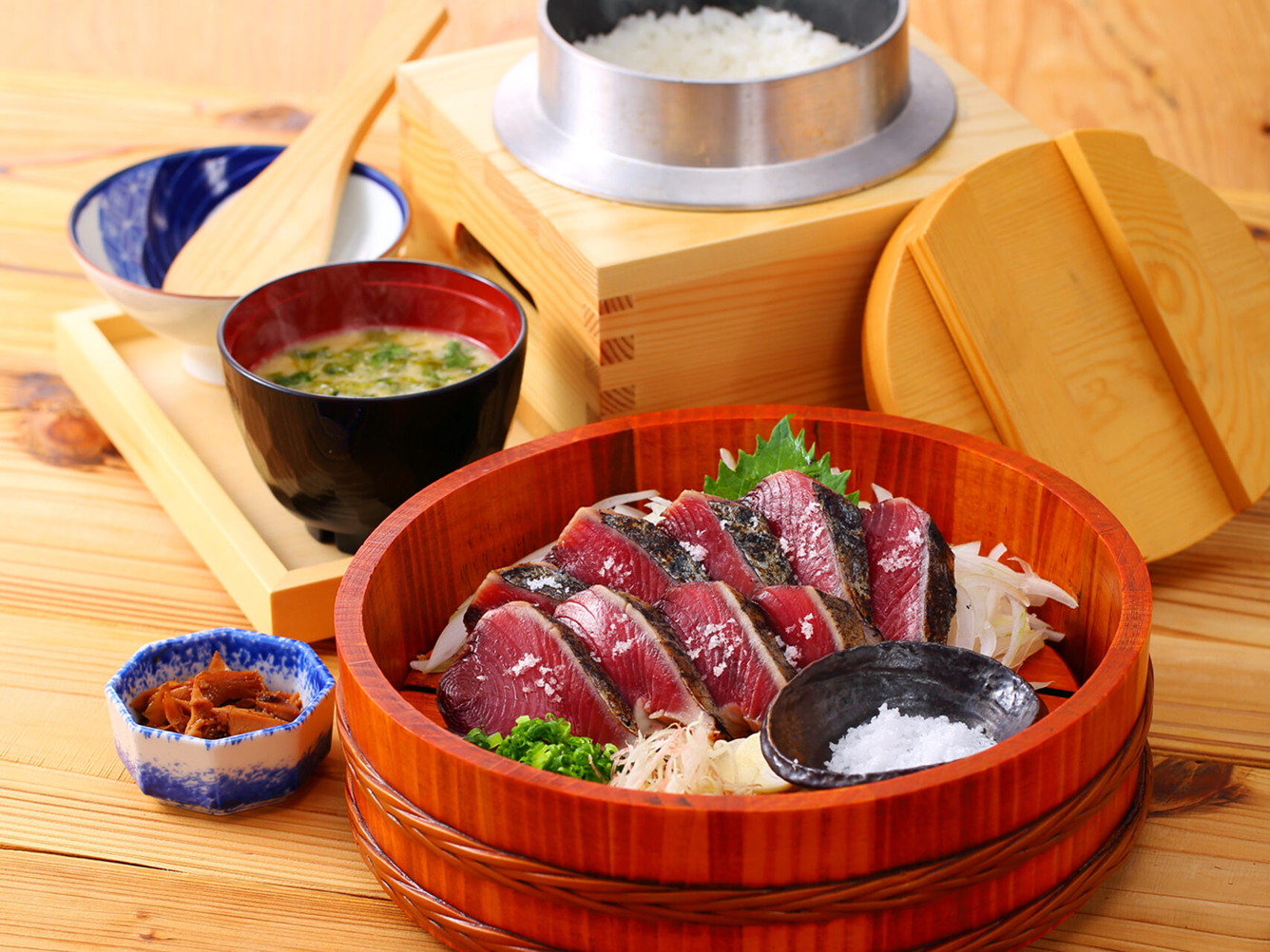 高知県から直送される脂の乗ったカツオを店内でわら焼きに。旨みが引き立った名物のたたきをぜひご堪能ください。また定食も人気です。ご飯は注文をいただいてから一人一釜ずつふっくら炊きたてを提供しております。高知県の四万十鶏のあおさ揚げやうつぼの唐揚げなど、ご当地の料理も一品料理として、多数ご提供しております。
