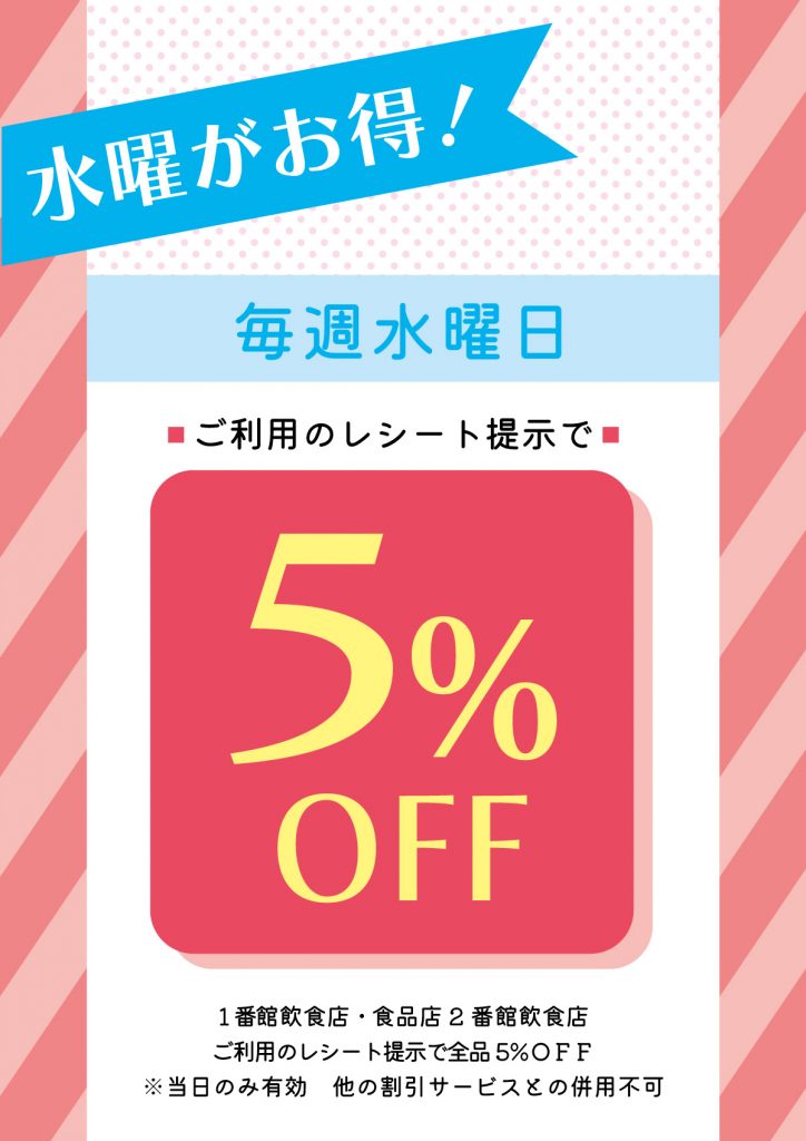 毎週水曜日、プレンティ一番館飲食店・食品店、二番館飲食店のご利用レシート提示で、